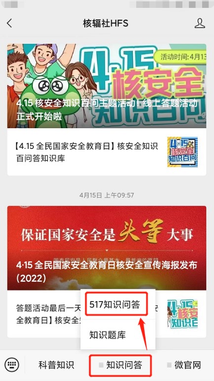 再次提醒,搜索【核輻社HFS】,或掃描下方二維碼,關注后,點擊菜單欄【517知識問答】,即可參與答題。