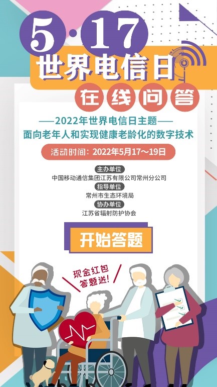 電信和信息通信技術在實現更健康的老齡化方面發揮作用,還可以幫助建設更加智慧的城市,確保老年人的金融包容性,并為世界數以百萬計的護理人員提供支持。為深入貫徹習近平新時代中國特色社會主義思想,普及相關電信知識,提高公眾對5G通信技術的認知,為5G建設營造全民共建共享的良好環境,為迎接黨的二十大勝利召開營造良好氛圍,常州移動主辦、常州生態環境局指導,江蘇省輻射防護協會協辦“5.17世界電信日在線問答活動”。問答內容涵蓋移動通信知識,5G技術等內容。