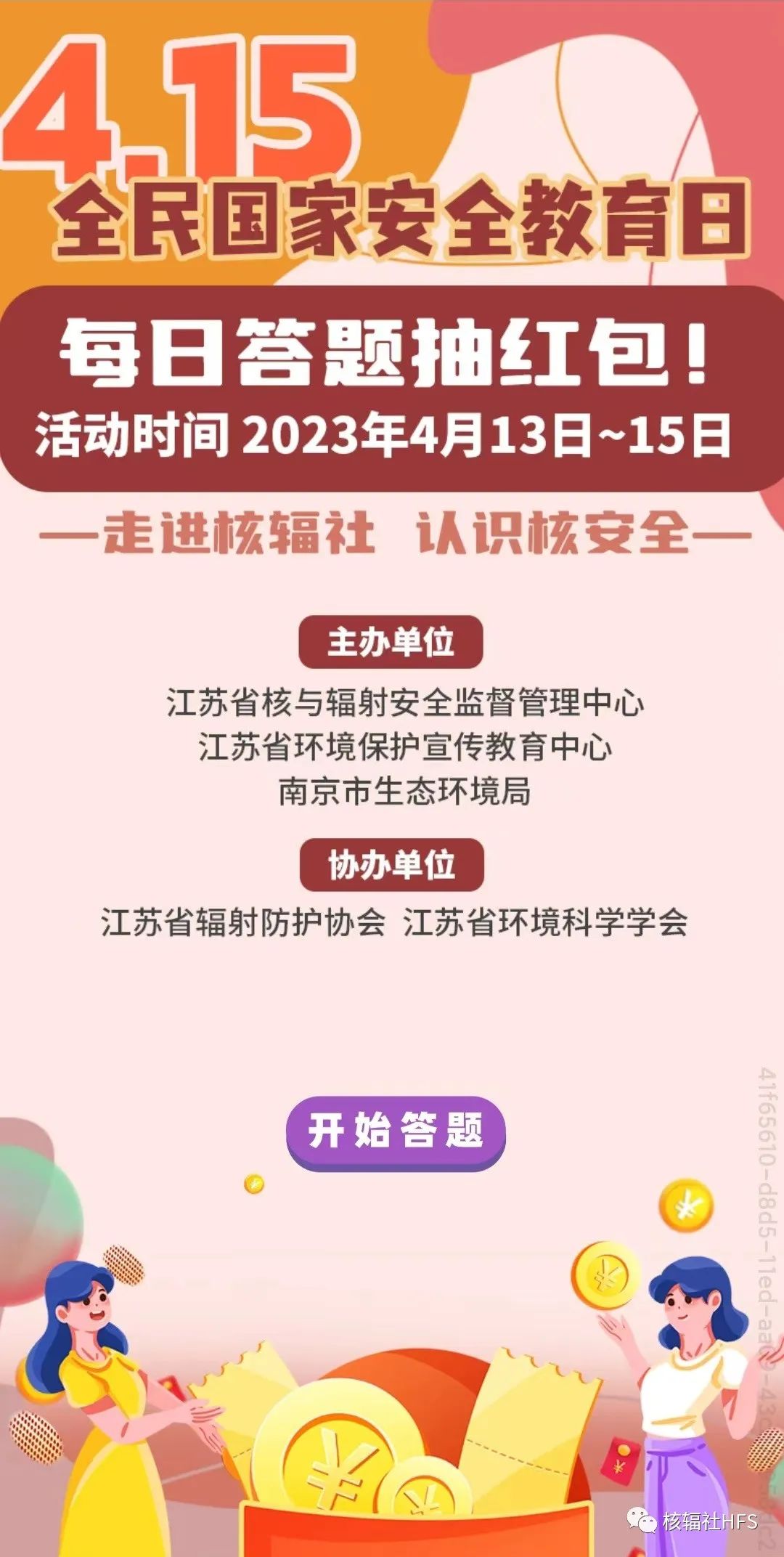 今年4月15日是第八個全民國家安全教育日。4月13日~15日,核輻社推出了“你答題,我送現金紅包”的主題活動。輻蛙社長為大家準備了數量多多的微信現金紅包。保證讓您學得充實,玩得盡興,紅包拿不停!
