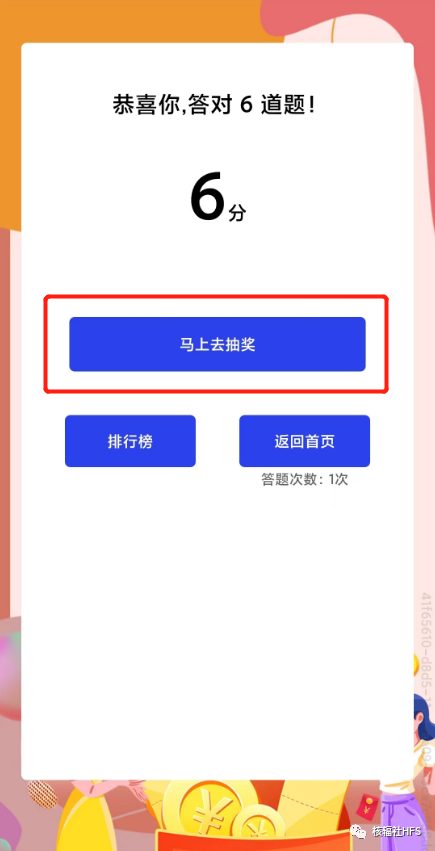 完成答題,即有機會抽取紅包獎勵哦!(根據規則答對一定數量的題目,即有機會參與抽獎,數量有限,先對先得哦!)