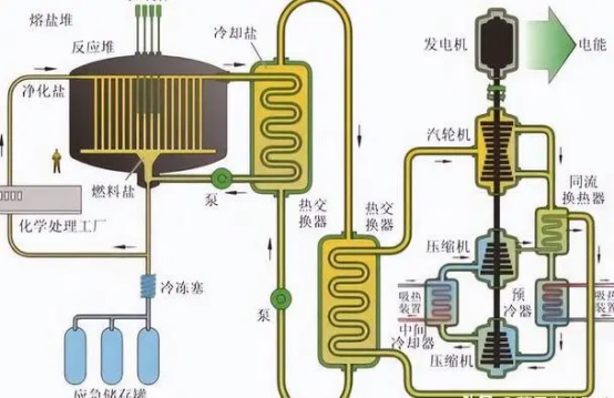 冷卻與傳熱過程:使用熔鹽(常見氟化物熔鹽等)作為冷卻劑,熔鹽熱物理性質優良,比熱容高、導熱系數大且蒸氣壓低,能在高溫下高效吸收和傳遞反應堆熱量。在反應堆內,熔鹽在泵驅動下循環,吸收熱量升溫后進入熱交換器,將熱量傳遞給二次冷卻劑(如水等介質),二次冷卻劑再傳遞給蒸汽發生器產生蒸汽,用于驅動汽輪機發電,冷卻后的熔鹽返回反應堆繼續循環。
