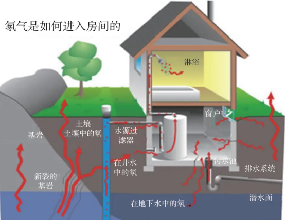 存在于巖石和土壤中的放射性物質由于地下水的浸濾作用而析出,這是地下水中天然放射性核素的主要來源。此外,粘附于地表顆粒土壤上的放射性核素在風力的作用下可轉變成塵埃或氣溶膠,從而轉入到大氣并進一步遷移到植物或動物體內。土壤中的某些可溶性放射性核素被植物根部吸收后,繼而輸送到可食部分,接著再被食草動物采食,然后轉移到食肉動物,最終成為食品中和人體中放射性核素的重要來源之一。氡的內照射氡氣是特別重要的一種天然輻射來源。氡的直接衰變產物是半衰期較短的放射性核素。氡氣主要從土壤中穿過地板進入建筑物,在封閉的空間里,放射性濃度會逐漸增加。如果房屋通風良好,氡氣的積累就不會很明顯。圖2是氡氣的產生途徑。