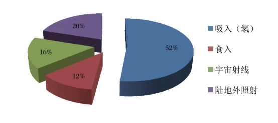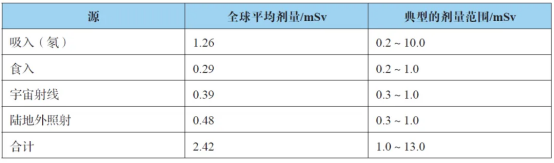 全世界公眾受到天然照射的人均年有效劑量大約為2.42mSv,不同途徑天然放射性對劑量的貢獻見表1(UNSCEAR)。其中,由氡衰變產物引起的全球平均年有效劑量估計值大約是1.26mSv,但不同地區的具體值偏離平均值較大。在有些國家(例如芬蘭),全國平均值是此值的好幾倍。