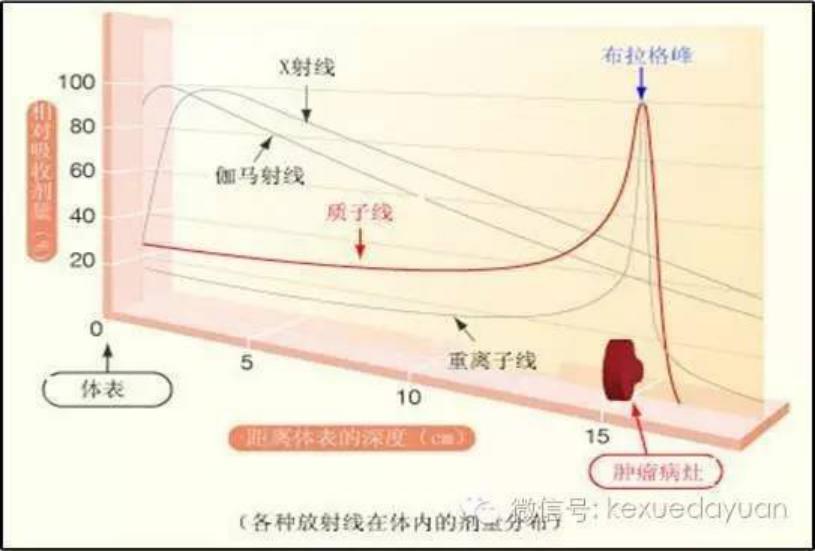 威爾森認(rèn)為,帶電粒子束或可在治療腫瘤領(lǐng)域有突出表現(xiàn),他的依據(jù)是:傳統(tǒng)高能X射線穿越人體時,沿途會不斷釋放大量能量,腫瘤前后的正常組織也受到了相當(dāng)劑量的照射。而帶電粒子束有獨(dú)一無二的“布拉格峰”,射線進(jìn)入人體后,高能帶電粒子束在射程前段僅會釋放較少能量,直至射程末端,巨大的能量才會徹底釋放,從而大幅減少了腫瘤周邊正常組織的照射劑量。