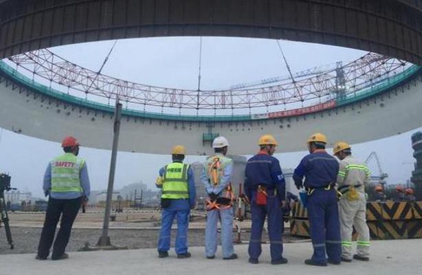 全球首個“華龍一號”示范工程,正在進行“筒體吊裝”。要想在福建沿海的大風中,把重180噸,直徑47米,厚6毫米的世界上最大超薄筒體,整體升高到25米高空,難度極大,不但如此,還要吊著這個大家伙行走54米,旋轉150度后再放下,整個動作要一氣呵成。中國工人有什么絕招?