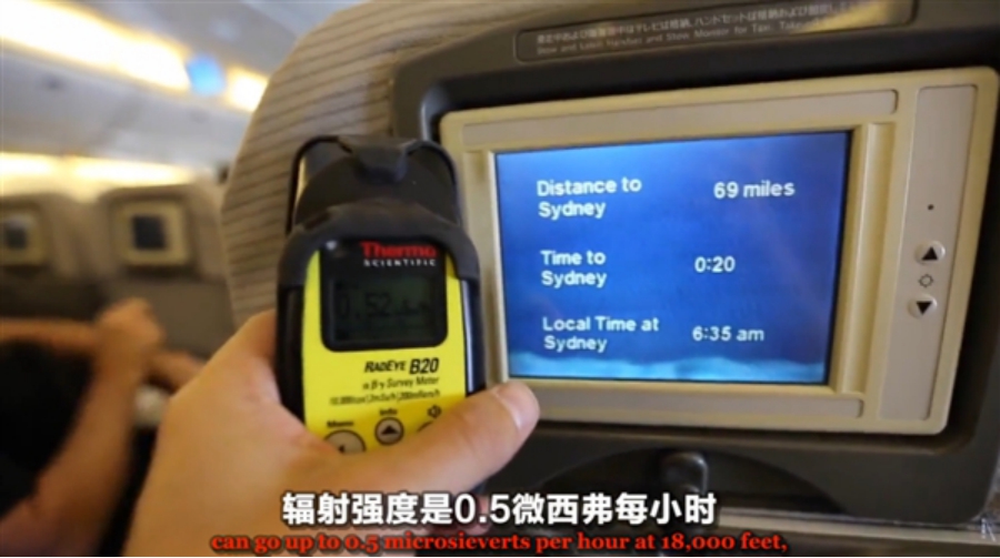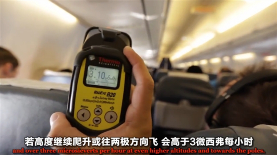 在飛機上受到輻射最大是在飛往兩級時,這時的輻射劑量已經(jīng)達到了3微西弗每小時。