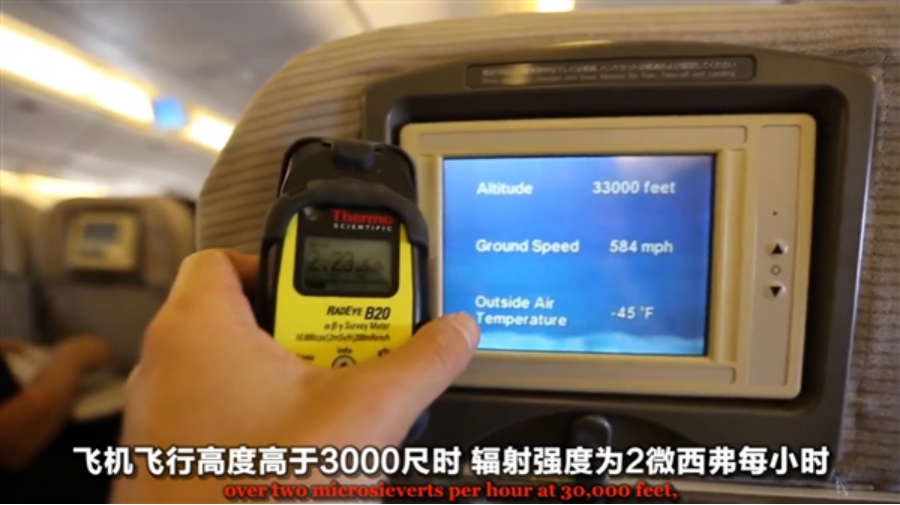 當(dāng)飛行高度處于18000英尺時,輻射劑量為0.5微西弗每小時;23000英尺時,輻射劑量則上升至1微西弗每小時;繼續(xù)上升至30000英尺時,輻射劑量直接翻倍變?yōu)?微西弗每小時。