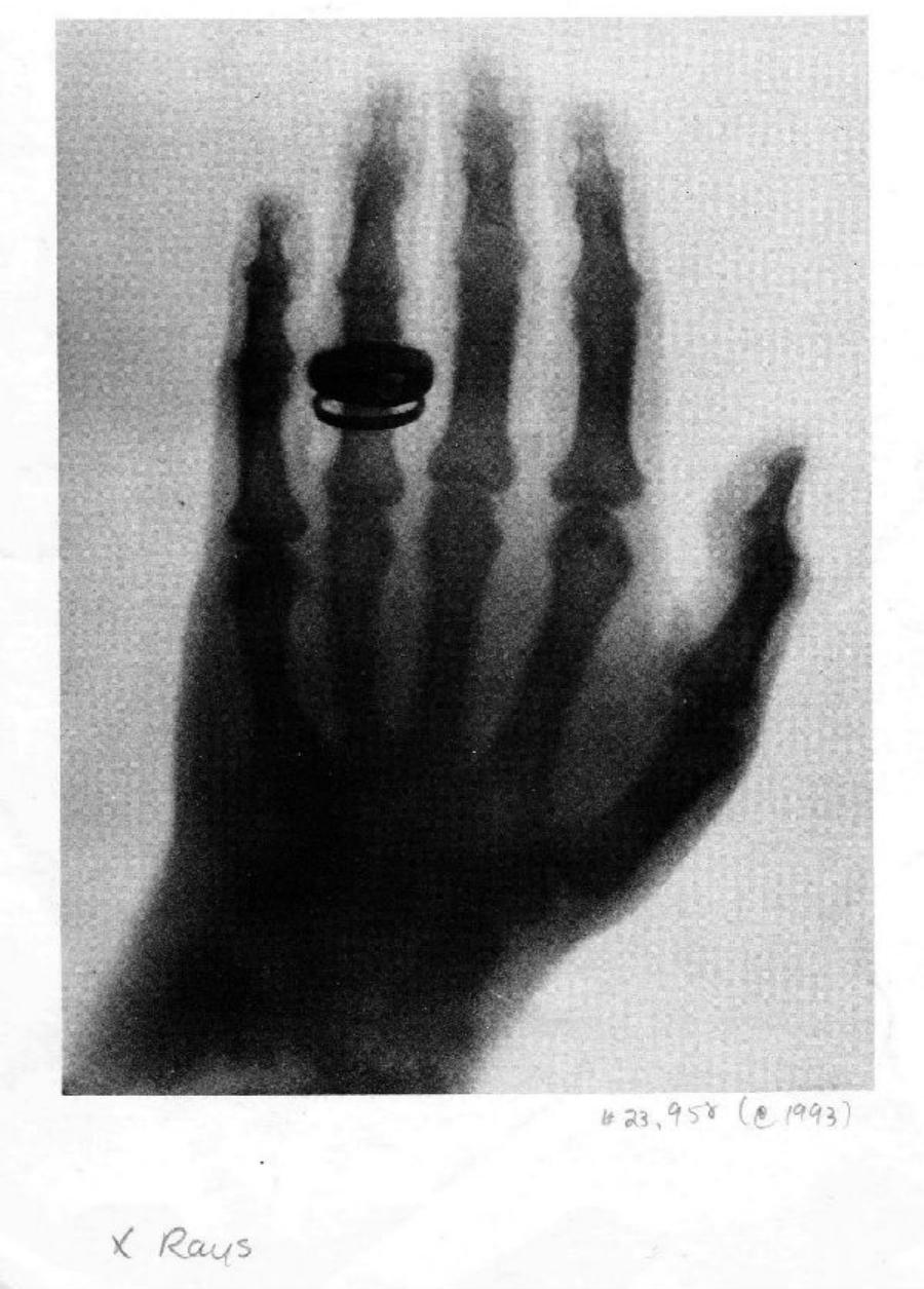 1896年1月23日,X射線發現者、德國物理學家倫琴以妻子的手為對象拍下了人類史上第一張X光片,圖中的“異物”是一枚戒指。