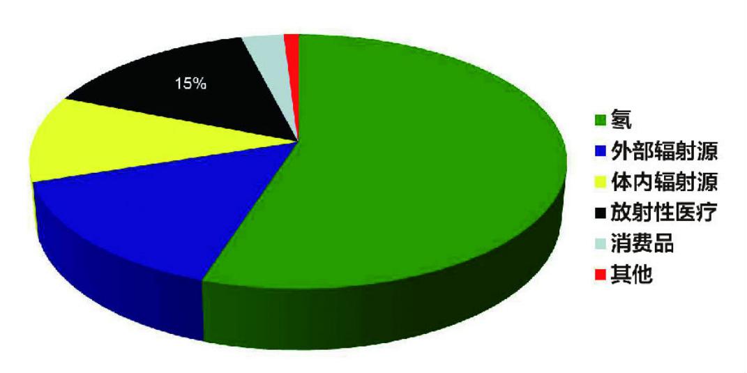 氡幾乎是日常生活中的頭號電離輻射源,圖為美國人均年輻射吸收量及來源組成。