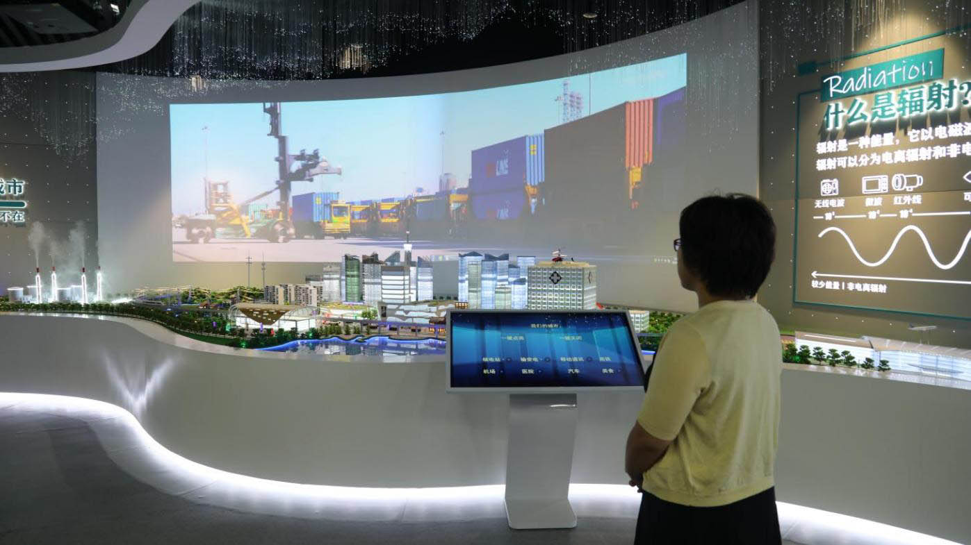 我們的城市綜合板塊,為了讓公眾在輕松愉快的情緒中了解輻射,該板塊通過 3D 物理沙盤來再現我們的城市,模擬公眾的日常生活場景,把可能會給我們帶來輻射的環境或設施,如:核電站、輸變電設施、醫院、通訊網絡設施等,合理巧妙地植入到沙盤制作中。