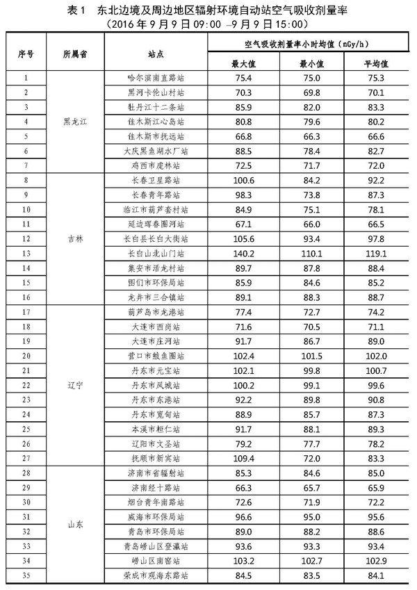 截至到9月9日15時,在東北邊境及周邊地區布設的35個輻射環境自動監測站實時連續空氣吸收劑量率監測數據處于當地本底范圍內。監測結果表明,朝鮮第五次核試驗目前未對我國環境和公眾造成影響。監測數據見表1。