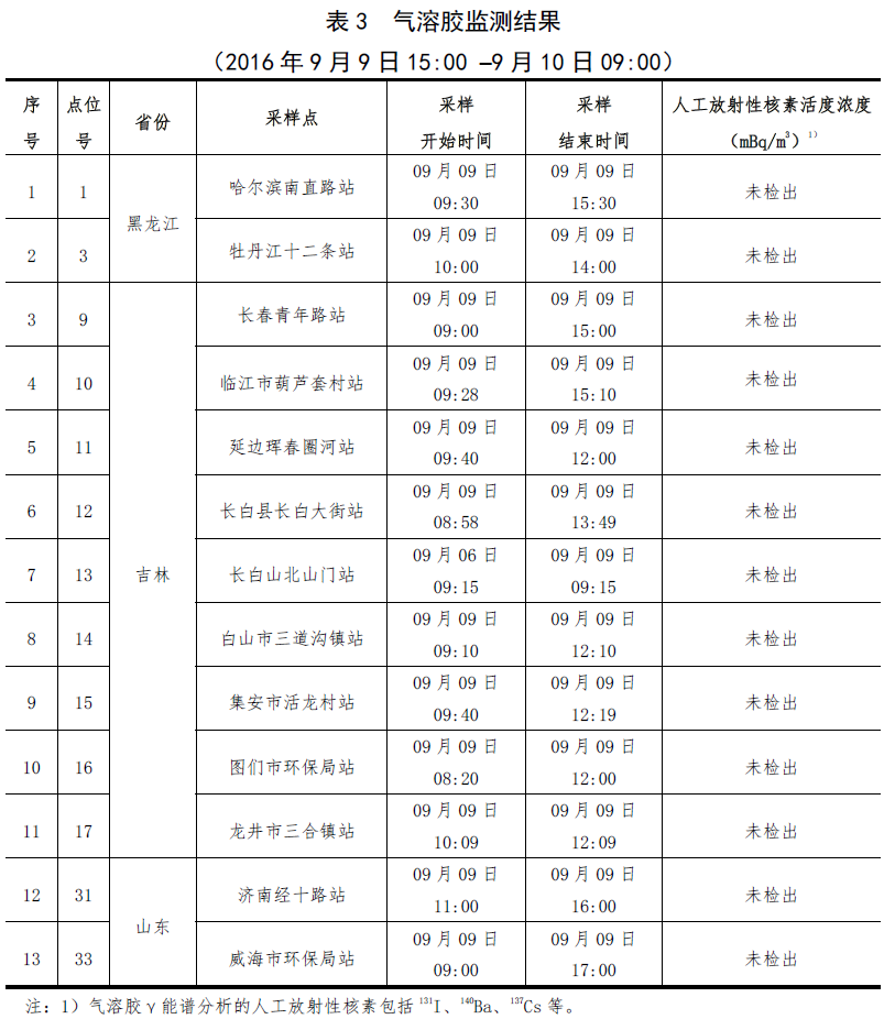 黑龍江、吉林和山東3個省份11個監測點采集空氣中碘,γ能譜分析結果表明,均未檢出人工放射性碘同位素。